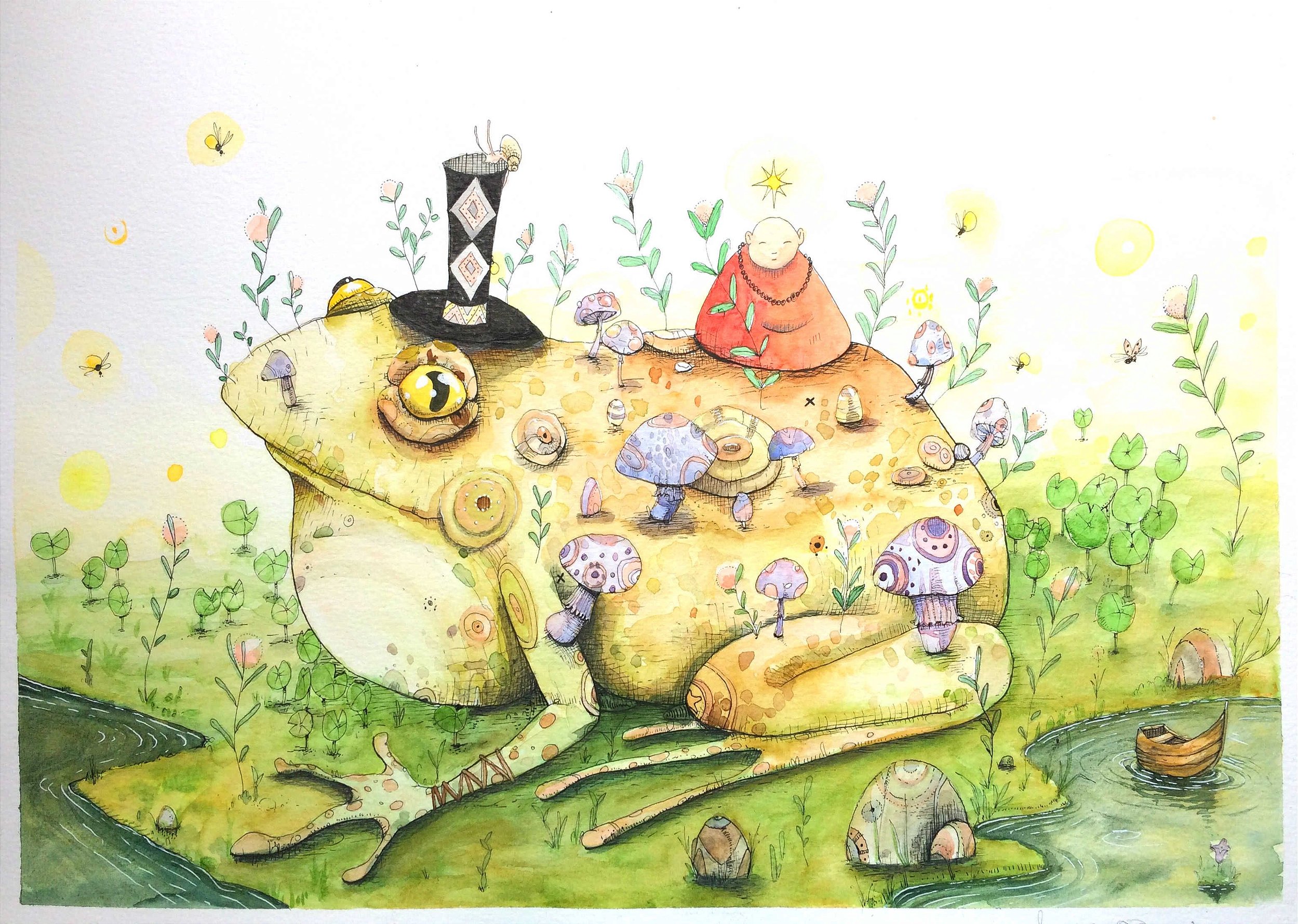 O sapo que achava ser pedra foi feito em aquarela no papel Montval no Tamanho A3. Disponível apenas em impressão.